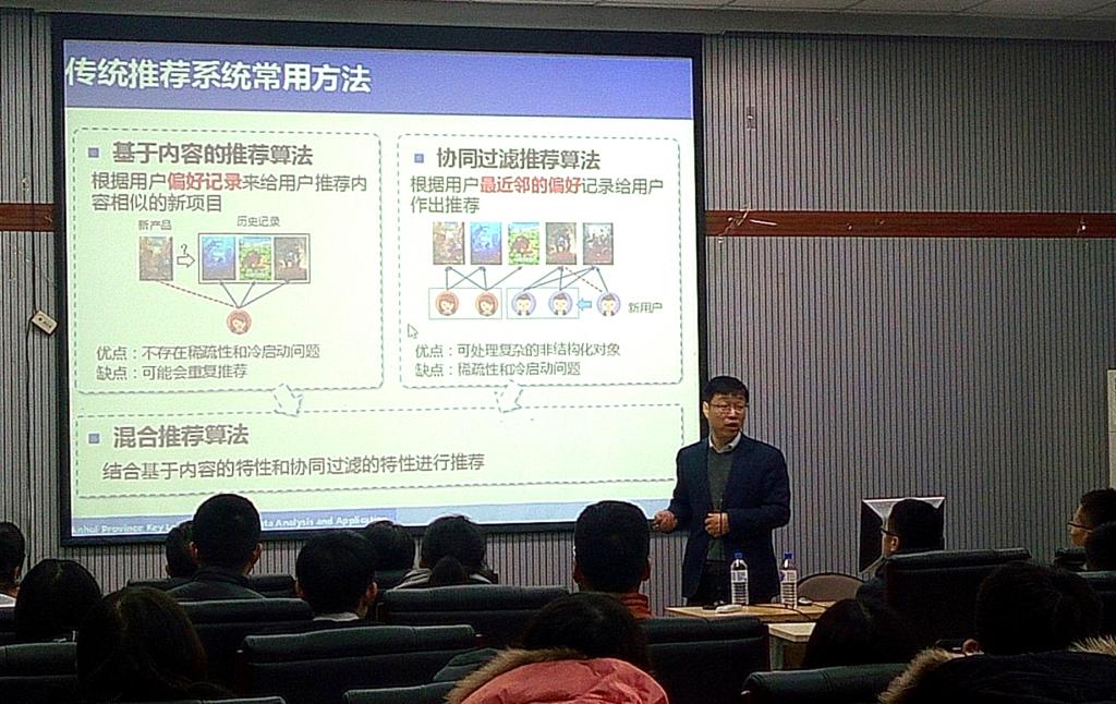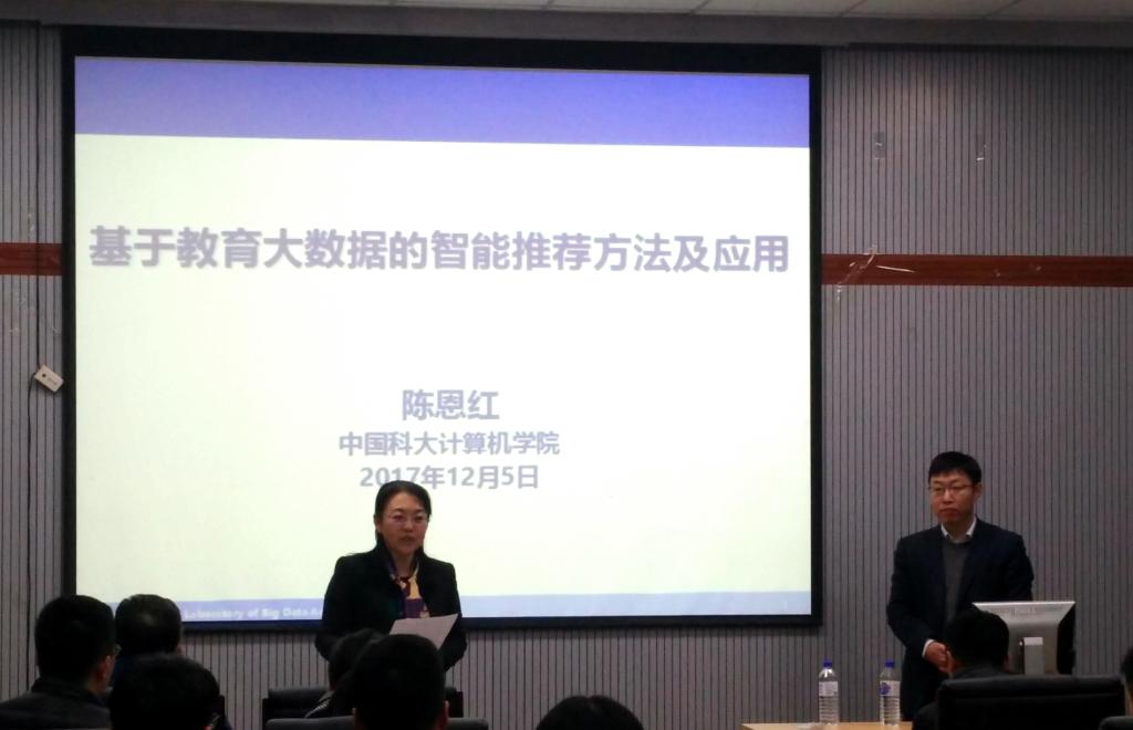 特邀中国科学技术大学陈恩红教授于计算机楼A521报告厅做了题为“面向智慧教育的数据挖掘技术研究与应用”的报告。计算机学院和软件学院近70名师生参加了报告会。