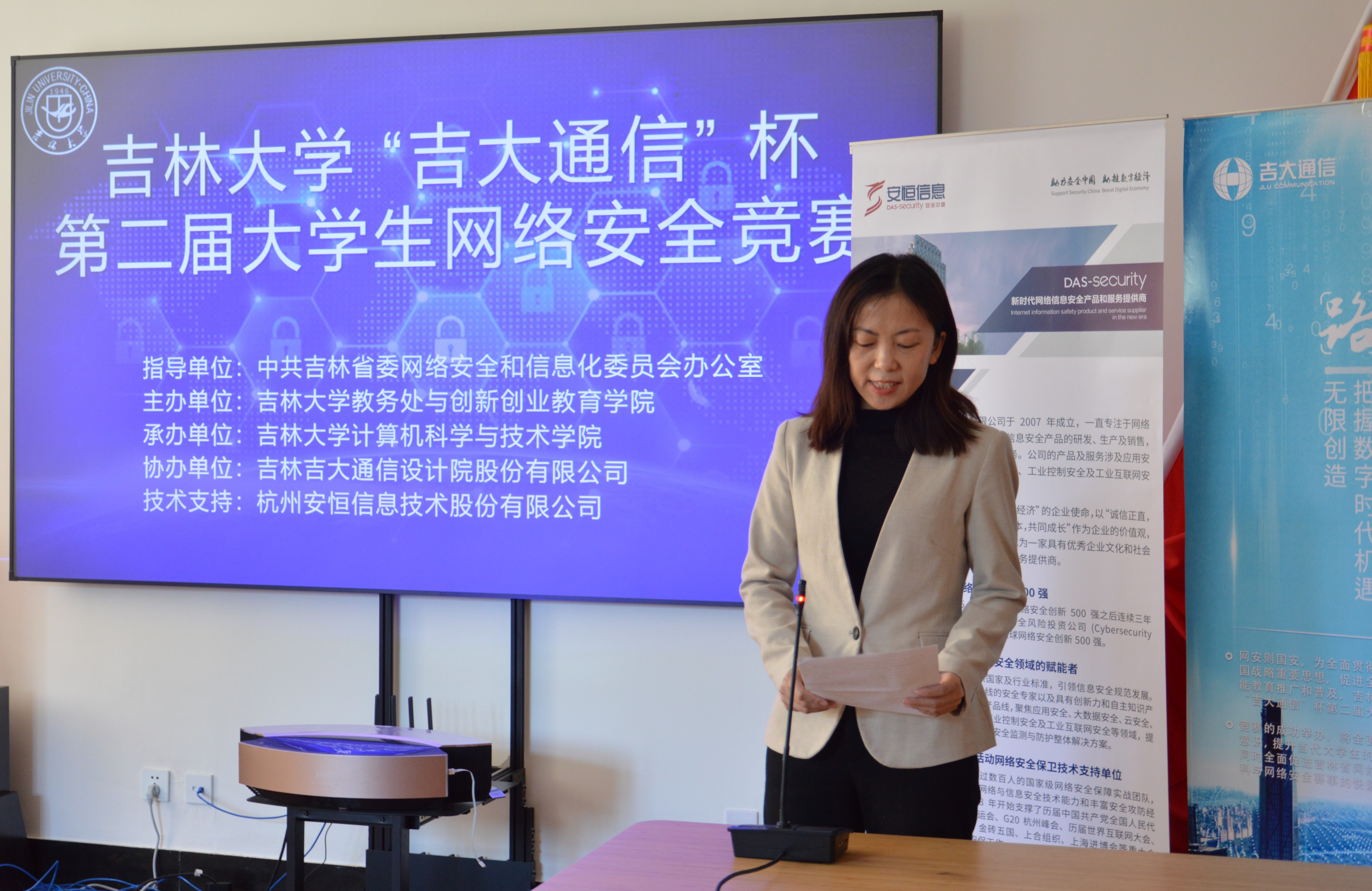 副院长黄岚教授发表了热情洋溢的讲话,她对获奖的同学表示祝贺,对协办单位吉林吉大通信设计院股份有限公司和技术支持单位杭州安恒信息技术股份有限公司的大力支持以及竞赛组委会的精心筹备表示衷心的感谢,并表示吉大人会“不忘初心、牢记使命”,麻豆tv