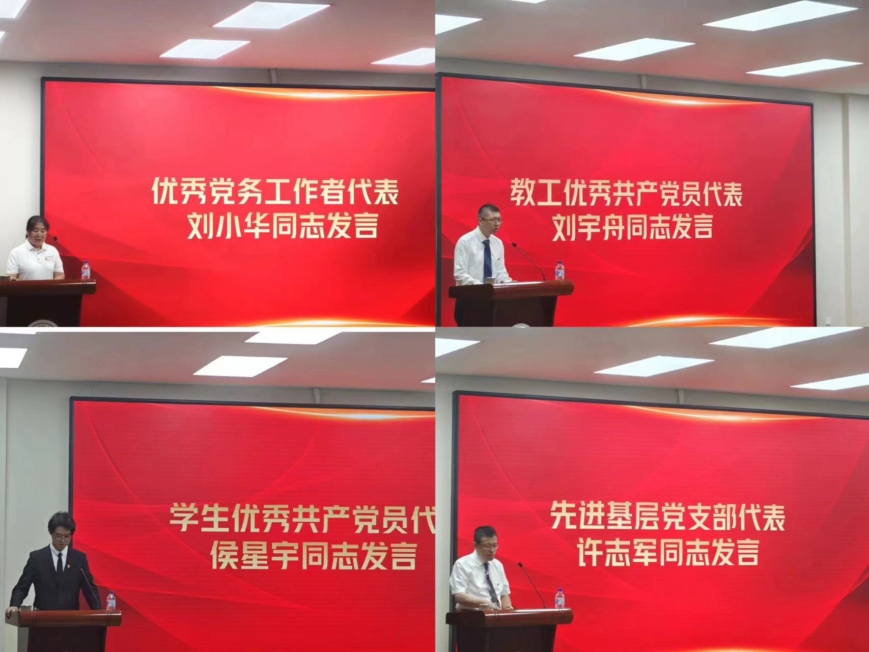 优秀党员代表刘宇舟、侯星宇,优秀党务工作者代表刘小华、先进基层党支部代表许志军分别上台发言,分享了他们和他们所在集体永葆初心使命、坚守责任担当,发扬党的优良作风和光荣传统,发挥基层党支部战斗堡垒作用和共产党员先锋模范作用的先进事迹和宝贵经验。