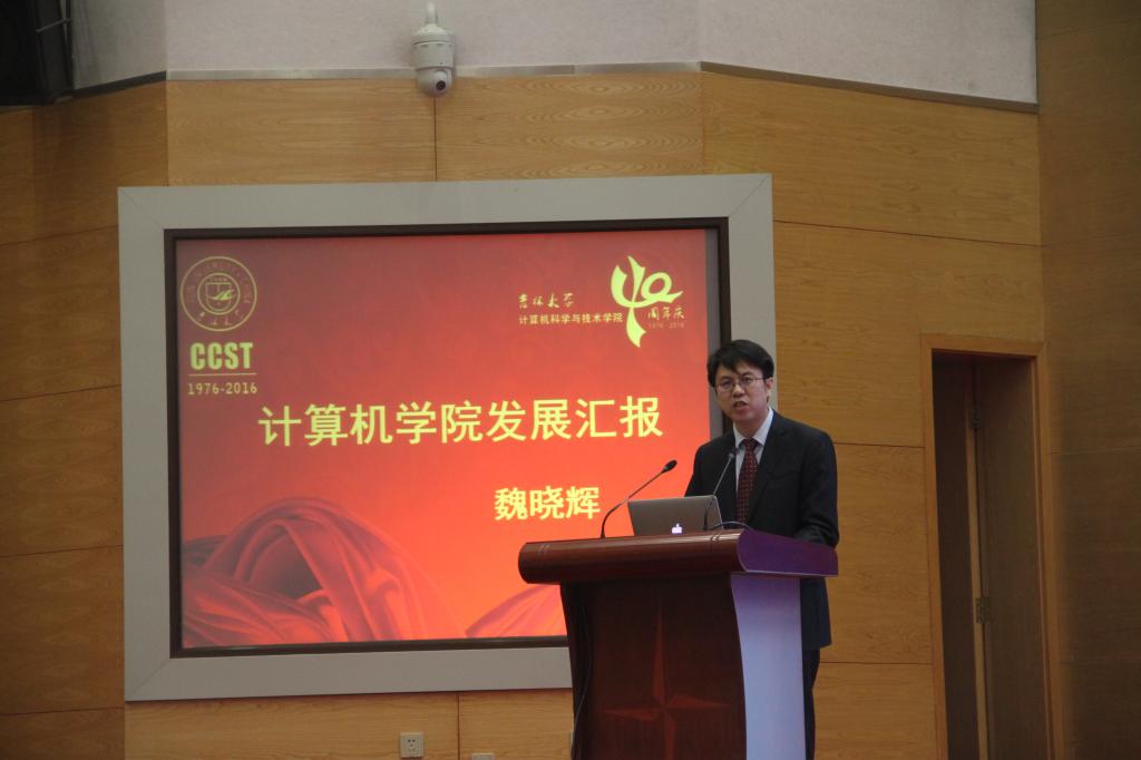 最后,计算机学院院长魏晓辉教授向大家汇报计算机学院发展历程。他按时间顺序从建系前期、建系与发展、院系合并、发展现状等方面回顾了学院的历史及发展,介绍了学院现有的18个研究团队和5个研究方向,并指出了学院所取得的成绩和存在的不足。感谢兄弟院校和学校领导的大力支持。号召全院师生凝心聚力、改革创新、立志图强,为把麻豆tv