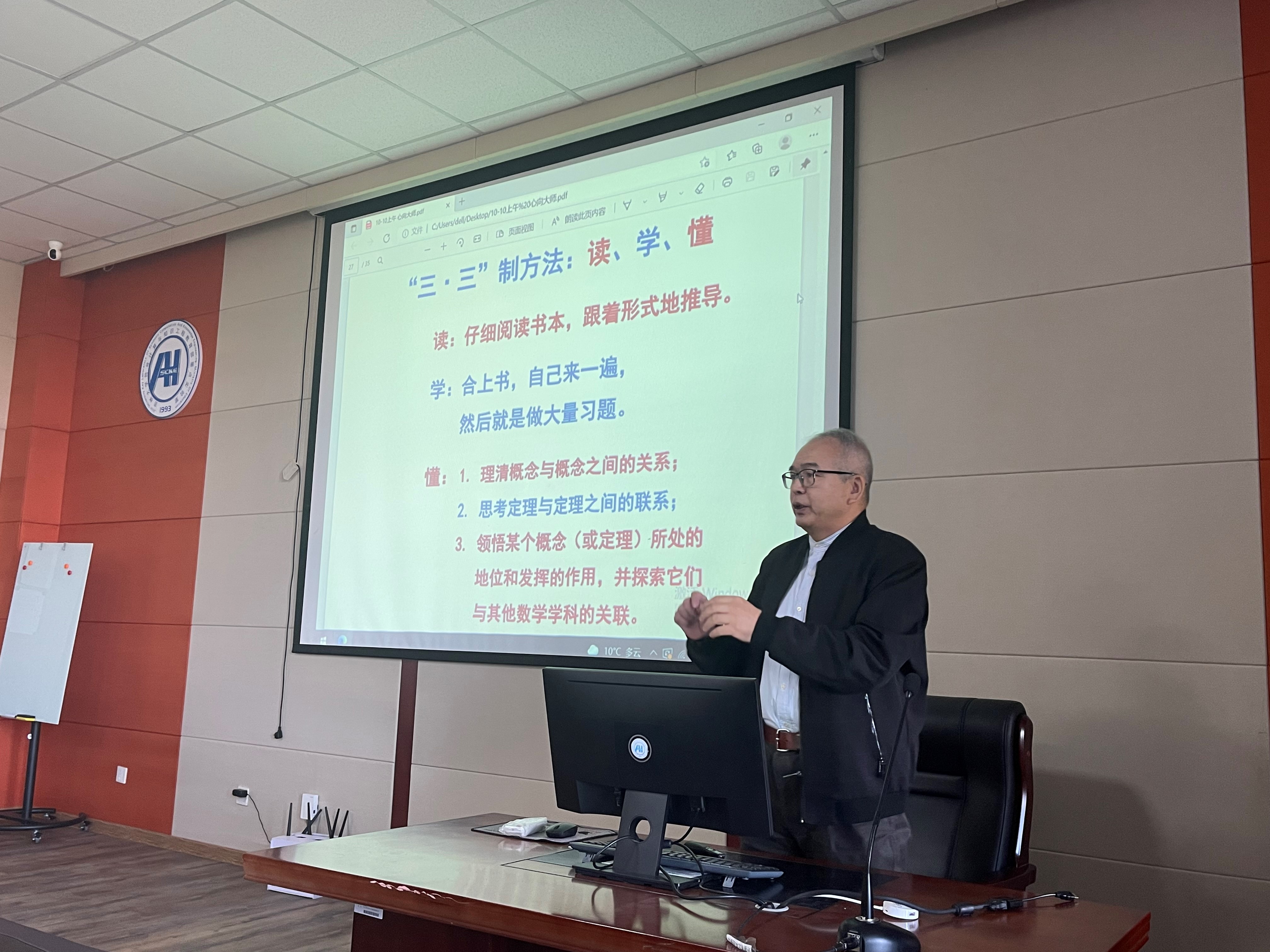 刘老师特别强调:影响成长的关键因素里,什么是最宝贵的?时间、时间,还是时间!什么是最重要的?坚持、坚持,再坚持!本科与研究生阶段是最有时间去学习的时候,要多花功夫了解和思考,同时最重要的是将基础打扎实。尽管花大量的功夫对每个学生都不容易,但绝不可错过最佳的学习时机。为此,刘老师为大家介绍了一种“三·三”制学习方法:读、学、懂。读是指:仔细阅读书本,跟着形式地推导。学是指:合上书,自己来一遍,然后就是做大量习题。懂是指:首先要理清概念与概念之间的关系;其次要思考定理与定理之间的联系;最后能够领悟某个概念(或定理)所处的地位和发挥的作用,并探索它们与其他数学学科的关联。