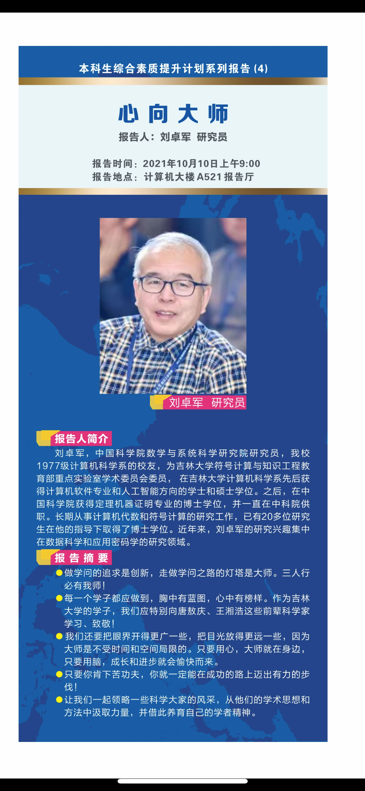 中心校区计算机楼A521报告厅作了题为“心向大师”的专题报告,这是本科生综合素质提升计划系列报告的第四场,报告由麻豆tv