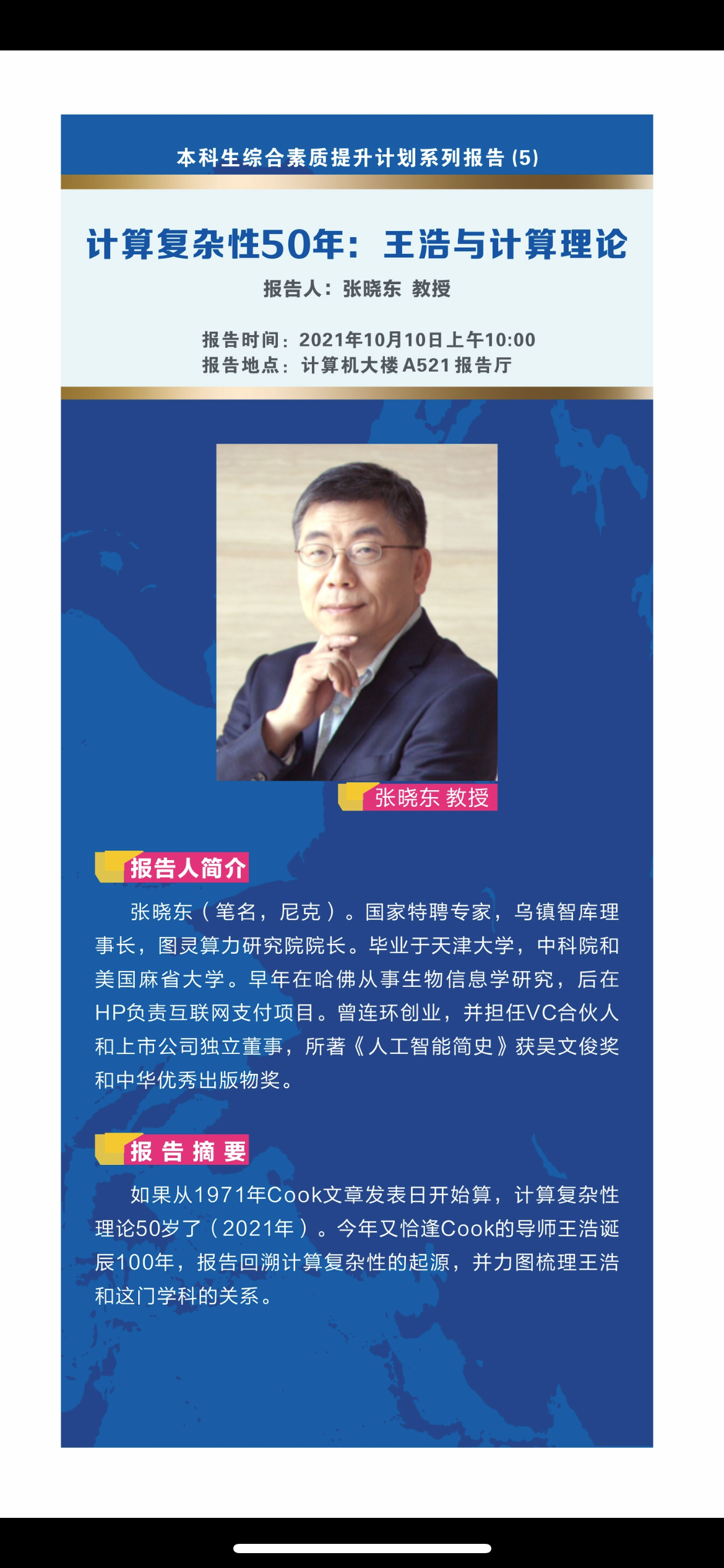 中心校区计算机楼A521报告厅作了题为“计算复杂性50年:王浩与计算理论”的专题报告,这是本科生综合素质提升计划系列报告的第五场,报告由麻豆tv