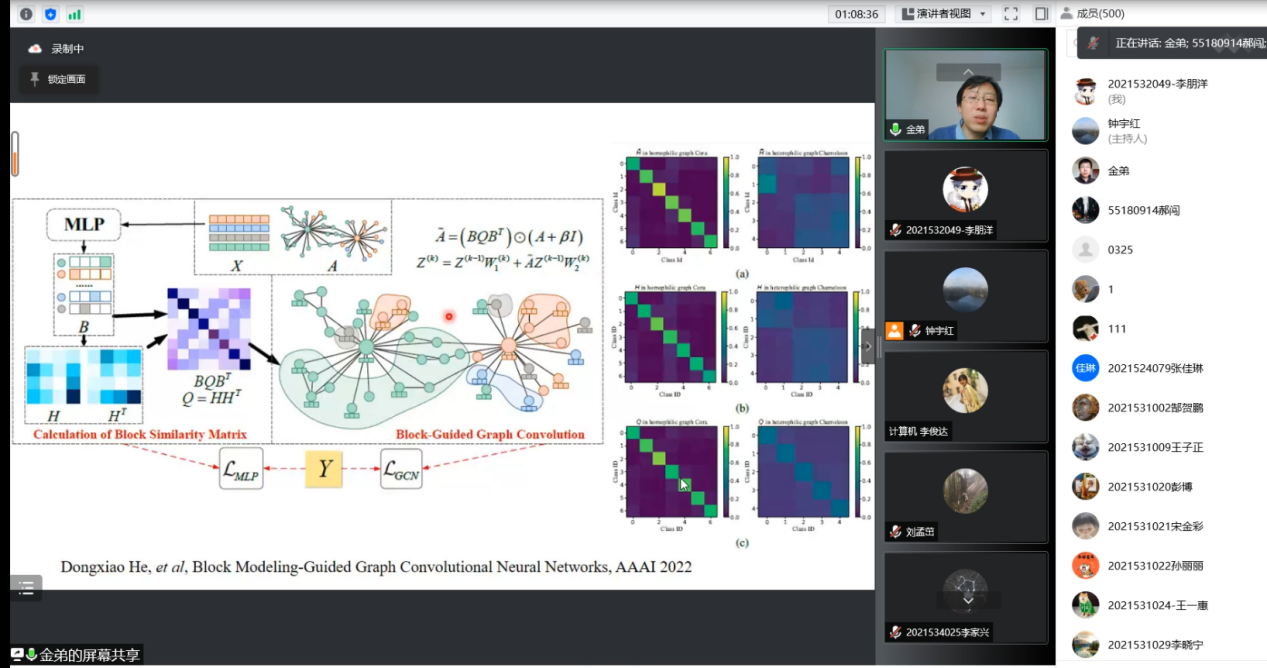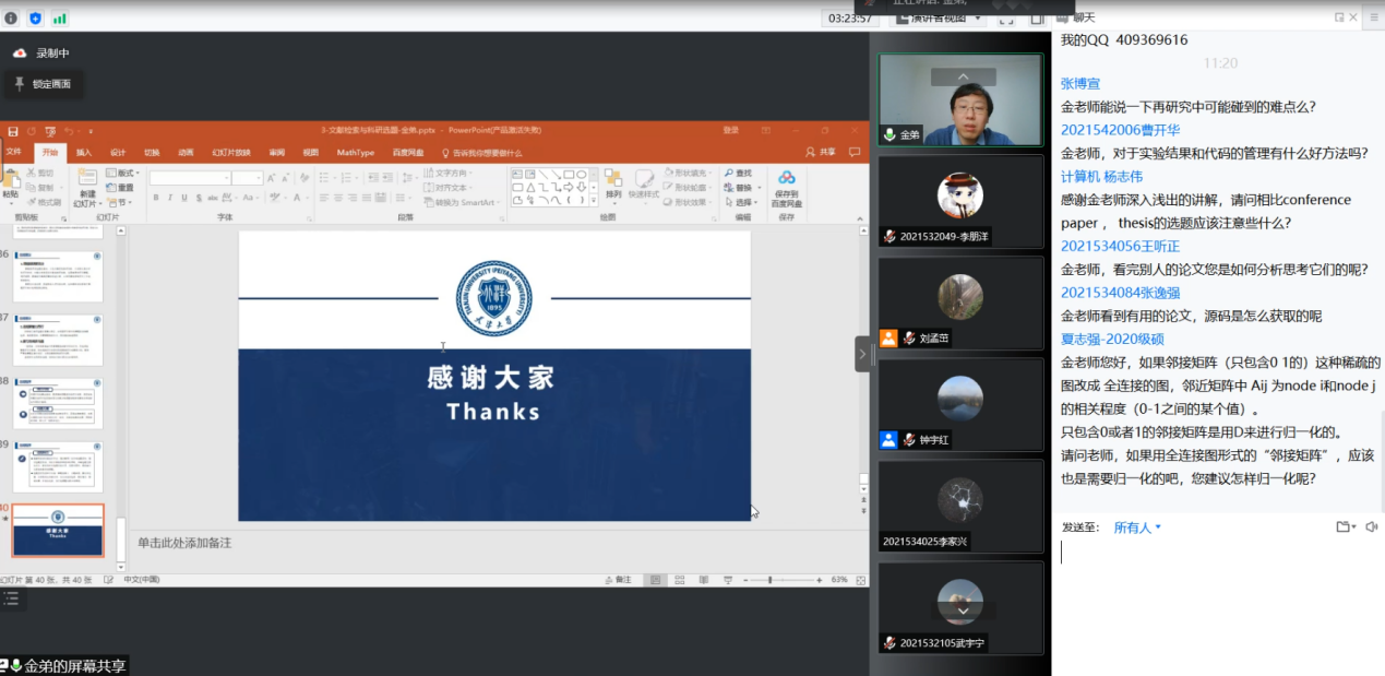 计算机学院副院长王喆教授主持了提问环节,同学们积极提问,金弟老师一一悉心回答,给出自己的理解与建议,同学们不仅了解到了学术前沿动态,对图神经网络的认识有了进一步提高,同时也学习到了论文写作必备的知识。本次活动受到了两院师生的热烈响应。没有一个冬天不能逾越、没有一个春天不会到来,祝愿疫情早日结束,师生平安健康!