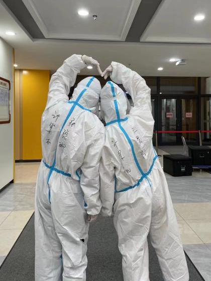 当志愿者们穿上防护服,北三公寓志愿者队的张爱琳感慨:“那是我们第⼀次感受防护服里的世界,脱下来的时候每个人都湿了头发,但大家依然开心能够贡献自己的⼀份力量”。学院高战国副书记与何老师亲赴一线,为同学们送来防疫物资,解决了送物资难,缺物资急的燃眉之急。