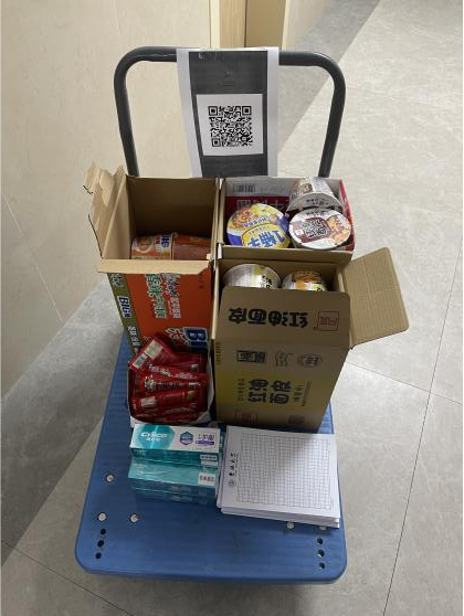作为北三计算机学院研究生最艰难的是,大家寝室集中在一楼东面,从西门送入的物资无法直接送达,需要先上二楼东面再下一楼,在封寝管控的初期,志愿者们没有小推车,只能人工搬运沉重的饮用水和盒饭,这给本就身体纤弱的女生志愿者们的配送工作带来了不小的困扰。虽然在最开始有些手忙脚乱,但是志愿者们在防疫物资缺乏的情况下不怕辛苦,不畏艰难,往返数次搬运物资,用强大的战疫决心保障了配送工作顺利的进展。