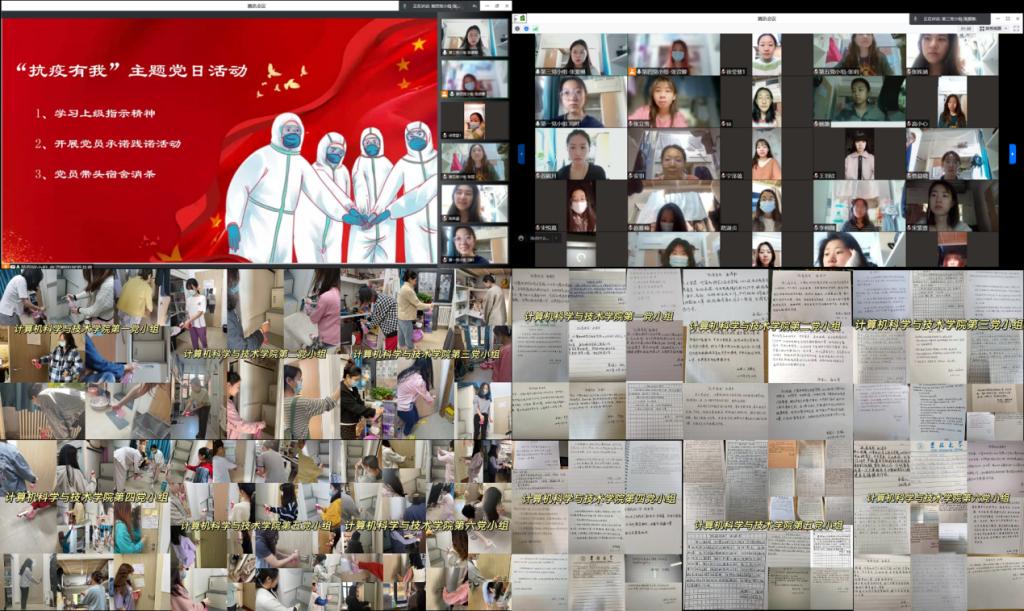 关键时候站出来、危急时刻豁出去、紧急关头顶上去。为进一步贯彻落实学院疫情防控的工作部署,充分发挥党支部战斗堡垒和学生党员先锋模范作用,计算机科学与学院陆续开展“发挥党员模范作用,一线“战疫”党旗飘扬”、“战疫一线党旗红”、“同心战疫,逆行有我” 、“奋勇‘党’先,‘疫’不容辞”、“抗疫中的点滴分享会”、“我看见的吉大力量”、“感动吉大,抗疫有我”以及“立足中国大地,讲好吉大故事”等党日活动,开展“抗疫有我”党小组活动。全体党员通过学习上级指示精神、开展抗疫事迹精神总结交流会、组织党员承诺践诺活动以及党员带头参与寝室消毒工作等,用自己的实际行动来诠释一名共产党员的初心和使命。