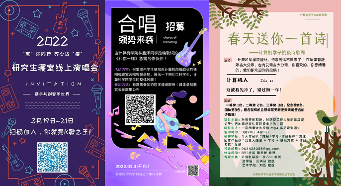 在隔离的闲暇时光中,为丰富同学们的寝室生活,促进室友之间的协作交流,计算机学院与多个学院联合开展了“‘寓’你同行 齐心战‘疫’”研究生线上演唱会。我院学子积极报名参与活动,同学们大展身手,展示多彩多样的曲目,既有爵士乐、也有古典音乐,还有合唱,用音符来抗击疫情,展现了大家乐观向上的精神风貌。
