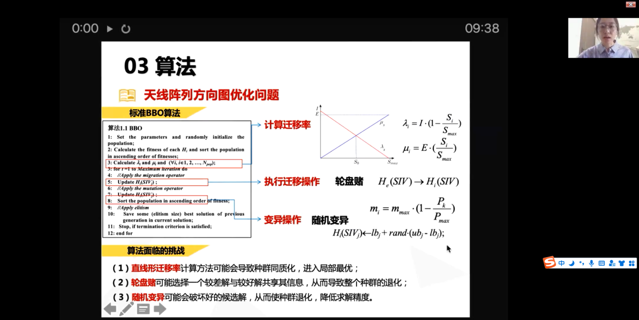 会议上半场,由讲者梁爽针对“天线阵列旁瓣抑制和充电无人机部署优化问题研究”为我们带来两篇学术论文分享。第一篇论文中,讲者首先描述了天线阵列优化具有有效提升系统容量、增益以及通信能效的好处,而后引入该优化中的主要问题——辐射方向图优化,并给出讲者团队的优化方案。该方案在标准BBO算法的基础上提出了BBOIMAM算法,将原算法中的标准正弦迁移策略优化为广义正弦迁移策略,并在算法中分别加入了基于精英学习的迁入策略以及基于弹性变异的自适应策略,最后通过不同阵元数量的天线阵列优化过程证实了该算法的有效性。在讲者的第二篇论文分享中,讲者针对传统WSNs中存在的能量受限问题,依次通过增加CUAV充电范围内传感器节点数量、最大化传感器节点和CUAV之间的充电效率以及最小化CUAV的总运动能耗,从而将多智能体的相互交互问题转换为全局优化问题,最终分别通过大规模和小规模场景下的实验分析表明了该算法较现有算法的先进性。