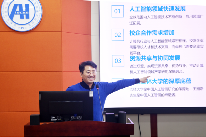 参观后,校友们返回学院报告厅,听取了由校友为研究生精心准备的学术报告讲座。申会长勉励同学们要终身学习,主动承担起科技兴国的责任。北京枫清科技有限公司联合创始人仲光庆和长春吉大正元信息技术股份有限公司副总裁高明亮分别作了精彩的学术报告。