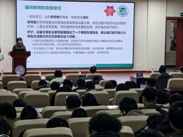 当日下午,全体师生齐聚王湘浩楼 B108,参加方班研讨厅专题报告。报告中殷丽华教授首先围绕“求源・熵减・思辨”教学方法,系统阐述方班研讨厅的教学理念与实践路径;随后,吴联仁老师介绍论文选题的9类方向,结合案例强调“先避坑”原则与选题关键;束成钢老师明确研讨厅5个核心角色,细化选题、准备、报告、总结各环节要求及“论文信息、背景、方法、实验”四大考核指标;孙哲老师给出课中提问标准与正反案例,同时指出课后总结的常见问题;朱天清老师从提问老师视角,阐述其“思维引导者与学术桥梁”的定位,结合具体案例讲解提问方法,强调前期研读准备的重要性及自身成长路径。