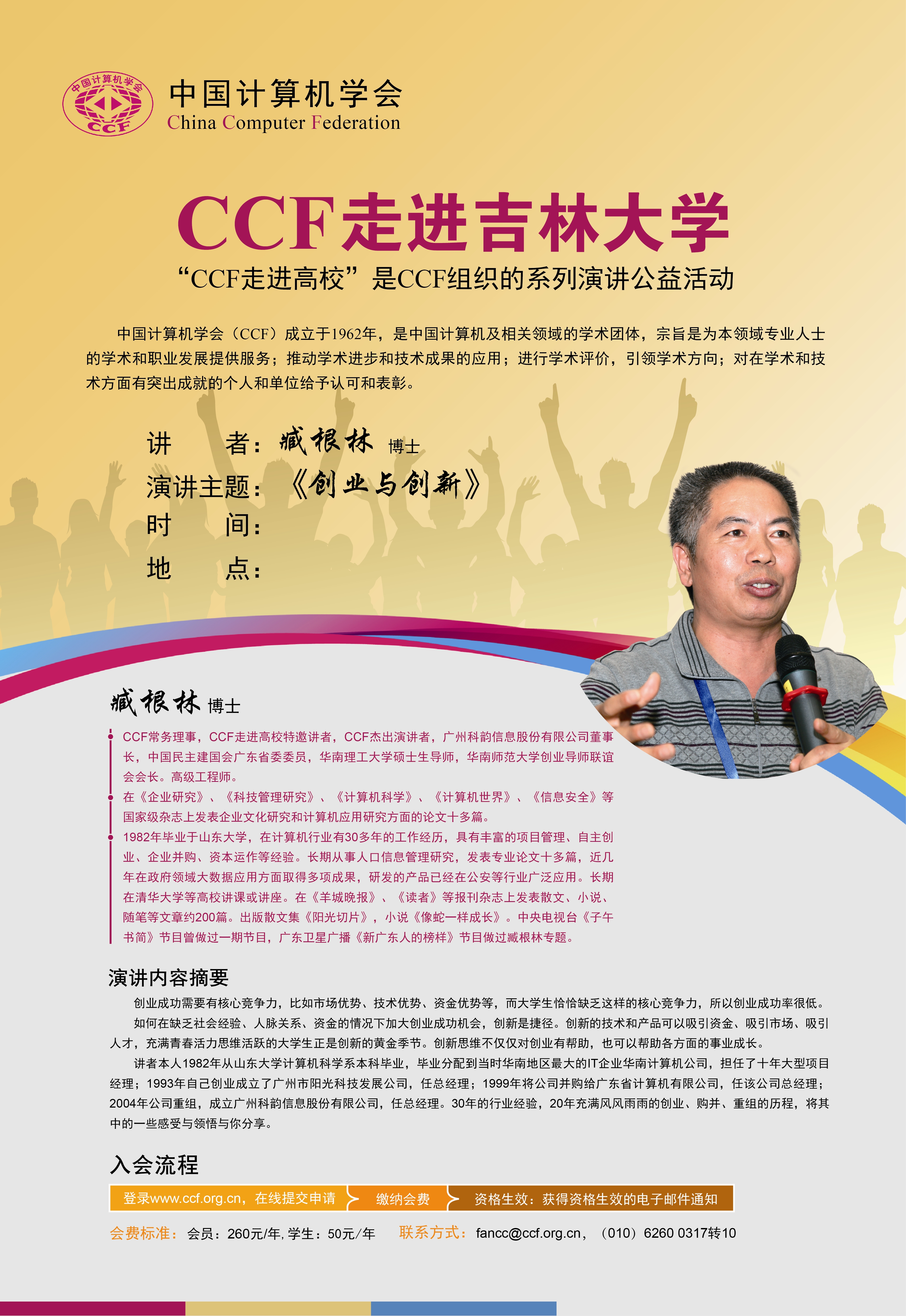 学院借CCF走进麻豆tv 之际,邀请创新创业培训专家臧根林,为我院师生做题为《创新与创业》主题报告,有意组队参赛的同学敬请关注。